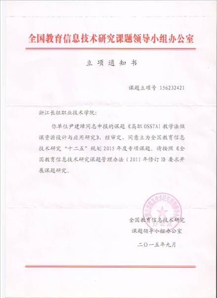 我院计信系计算机网络技术专业教研室尹建璋老师主持的《高职OSSTAI教学法微课资源设计与应用研究》获得全国教育信息技术研究“十二五”规划2015年度专项课题立项。该课题研究适合OSSTAI教学法的分层级微课资源设计与应用方法,使微课资源服务于课程的分层教学目标,提高微课资源的利用率及实效性,并在此研究的基础上,以我院计算机网络技术专业的网络实用技术基础课程为例,设计出部分分层级的微课资源。