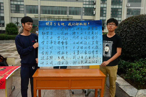 活动首先到各班宣传“文明修身,德与我行”大学生素质道德教育,争做文明先锋以及在各班教室粘贴文明修身标语。其次大一新生在晚自修期间开展主题班会并在班级负责人的带领下宣读修身宣誓词,并对提前五分钟进课堂和实行无手机课堂表示支持并严格遵守,气氛热烈。活动的最后是争做文明修身标兵的签字活动,天气虽炎热,但师生们踊跃参加,活动现场秩序井然。