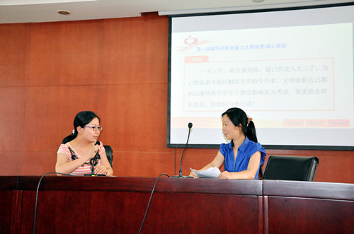 为贯彻落实教育部《普通高等学校辅导员队伍建设规定》等文件精神,促进辅导员队伍职业化、专业化发展,6月9日至11日,我院举办了首届辅导员职业能力大赛,全院8个系共24名班主任、辅导员参加了比赛。学院副院长、党委副书记王其军教授、督导室主任高晓红教授、学生处处长陆栋煜老师以及团委书记陶元老师担任大赛评委,各系党总支书记以及所有辅导员到场观摩比赛。