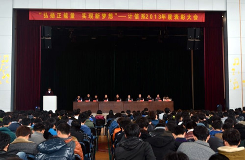 2014年2月26日下午,计信系在学院体育馆隆重召开了“弘扬正能量,实现新梦想—2013年度全系师生表彰大会”。学院副院长杜宝山、工会主席洪骏、财会学院院长兼学院教学督导室主任高晓红、学生处处长刘东、校企合作处处长何光平、院团委书记陶元、教务处副处长黄华、学生处副处长姚瑜滢、计信系系主任盛法生、党总支副书记陆栋煜等院系领导及1000名师生参加了此次表彰大会,大会由辅导员章剑飞老师主持。
