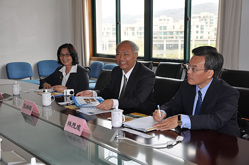 2013年3月18日上午,台湾观光学院校长张瑞雄教授,研发处长林茂成,教务长刘家榛一行三人来我院访问交流。学院执行院长吕振合教授,副院长杜宝山教授,教务处王海慧处长,管理系范平主任,校企合作处张敬伟处长等领导与台湾观光学院领导进行了交流与洽谈。