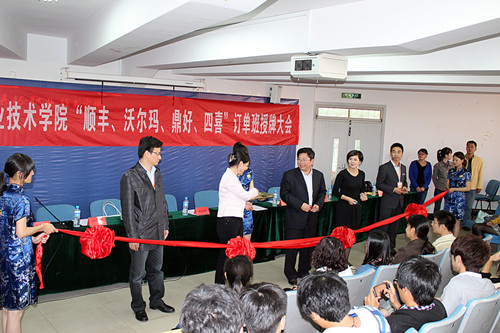 10月17日下午在浙江长征职业技术学院1117礼堂召开了由商务系和沃尔玛(浙江)百货有限公司、顺丰速运有限公司、杭州鼎好科技有限公司、杭州四喜信息技术有限公司四家企业成立订单班的授牌大会,分别成立了沃尔玛订单班、顺丰订单班、鼎好订单班、四喜订单班。会议由校企合作处处长张敬伟主持,学院副院长杜宝山出席此次大会,同时出席会议的还有沃尔玛人力资源HR经理蔡秋秋,顺丰高级经理王建东,鼎好营销总监沙汉林,四喜副总经理陈炎良及商务系各教研室主任等。
