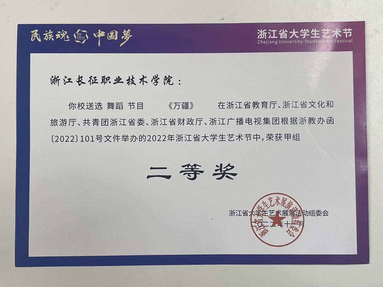 在2022年浙江省大学生艺术节中,由我校人文与教育学院选送的舞蹈节目《万疆》荣获甲组二等奖、舞蹈节目《点亮中国》荣获甲组三等奖的好成绩。