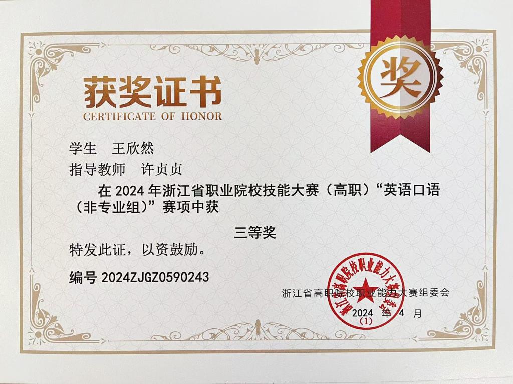 近日,2024年浙江省职业院校技能大赛高职组“英语口语”赛项在绍兴职业技术学院举行,来自全省49所高职院校的156名选手同台竞技。经过激烈角逐,我校管理学院王欣然同学(指导老师:许贞贞)和商务与贸易学院王婧珂同学(指导老师:金晶)荣获专业组三等奖。
