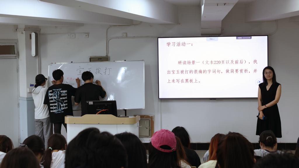 本次观摩由人文与教育学院陈媛媛老师主讲,授课班级为24网络新闻班,教学内容为大学语文课。陈老师以《红楼梦》中“宝玉挨打”这一经典事件为切入点,通过文本阅读、视频赏析、小组讨论、角色扮演等多元化教学方法,引导学生探寻宝玉挨打的原因、过程、及挨打后众人探望宝玉的情景。上课过程中,她巧妙地将作品文本分析与文化批判深度融合,充分展现了课堂地深度与张力。