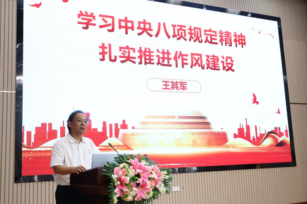 在专题党课环节,王其军为全体党员做了主题为《学习中央八项规定精神 扎实推进作风建设》的专题党课。他从中央八项规定的发展历程、深刻领悟中央八项规定精神的重要内涵、深刻认识加强党的作风建设的重大意义三个维度为大家系统解读了中央八项规定的重要精神。希望全校党员干部深刻领会“作风建设永远在路上”的重要意义,坚持真抓实干,坚守底线思维,积极推动作风建设与学校事业发展深度融合,以优良作风为学校高质量发展赋能增效。
