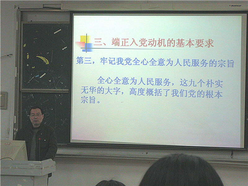 在将近一小时的授课过程中,洪骏老师提出,希望同学们能够把握好机会,通过自身的努力争取早日进入党组织。而后他又向学员们详细介绍了入党的内在原因和真实目的,列举了大学生入党的不良动机,剖析了不良入党动机的成因并提出了端正入党动机的三个基本要求。
