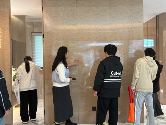 在久映颂月府别墅样板房现场,课程组教师结合实景,围绕“空间规划、材料工艺、软装搭配、智能家居”等核心知识点展开讲解,并引导学生通过观察、记录、提问等方式深度参与学习。